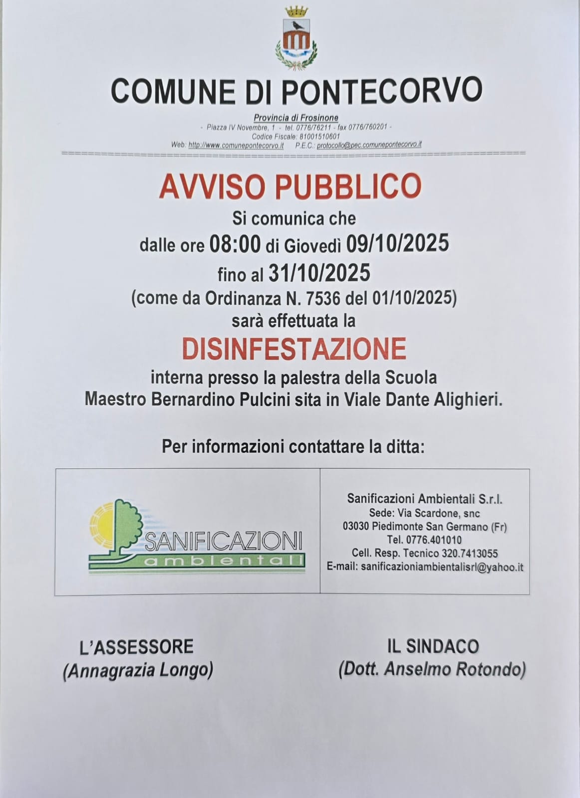Disinfestazione palestra scuola Maestro Bernardino Pulcini